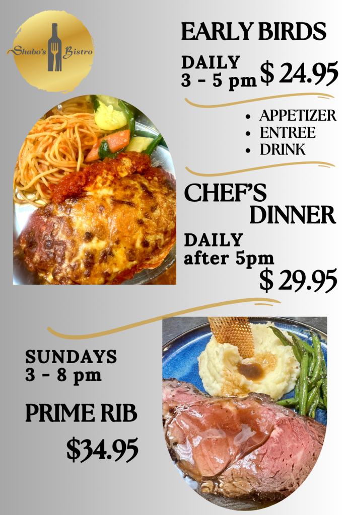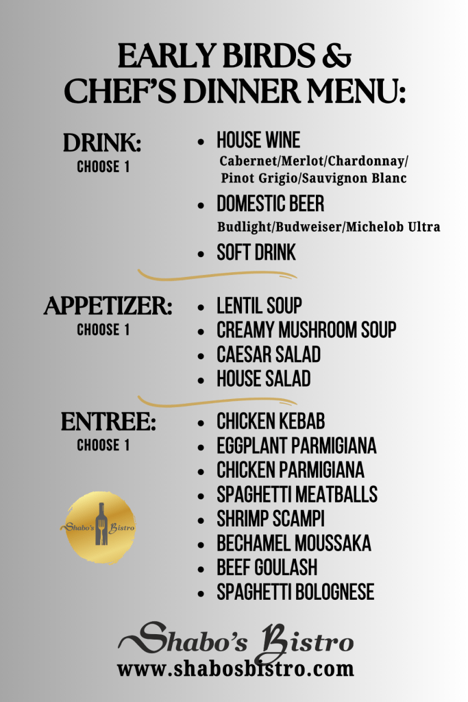At Shabo’s Bistro, we offer a diverse range of menus that highlight the flavors of contemporary American and Mediterranean cuisines. Whether you’re looking for a relaxed happy hour, early birds special or a delightful dinner, we have you covered. Our talented chef have curated a selection of dishes that will tantalize your taste buds and leave you wanting more.